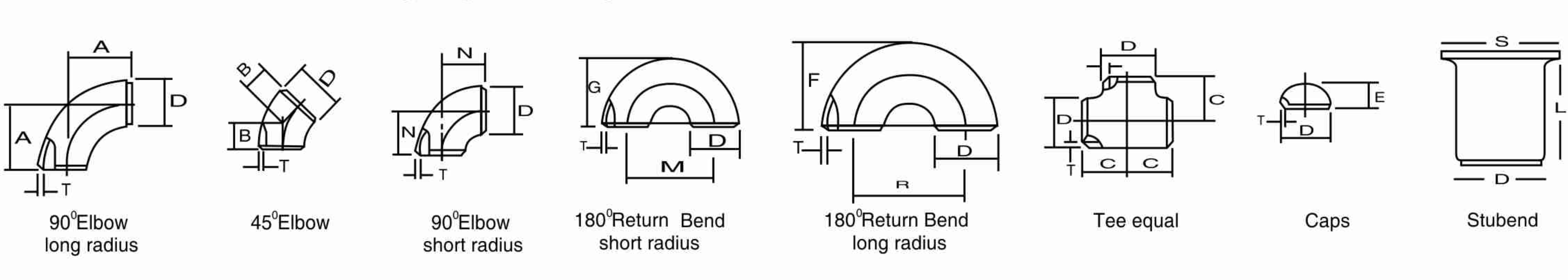 | Form | Seamless & Welded, Long Radius & Short Radius Elbow 90°, Long Radius Elbow 45°, Long Radius & Short Radius Elbow 180° (Return Bend), Reducing Elbow, Equal Tee, Unequal Tee, Crosses, Concentric Reducer, Eccentric Reducer, Long Stubend, Short Stubend, Coller, Pipe Cap, Long Radius Bends R = 3D, 5D, 6D, 8D, 10D & 20D in 15°, 30°, 60° & 90°, Drawing Based Butt Weld Fitting (Customised) |
